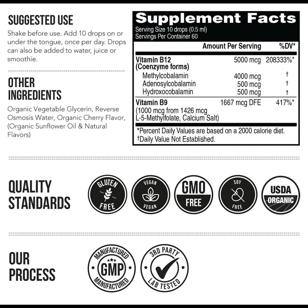Triquetra BioActive Vitamin B12 5000 mcg ofrece beneficios clave para la energía celular, el metabolismo, el estado de ánimo y la función cognitiva, gracias a sus tres formas bioactivas de B12 y su cofactor de metilfolato.